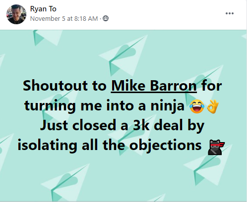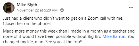 "The Live Master Training was transcendent 🔥 today! I kid you not, my certification here is worth more to me than my Architectural Drafting degree, and I'm not just talking dollar bills either. Mike Barron is sharing gems that transcend any one industry or field. This is coaching and mentor-ship as I have never experienced from the hands of "professionals".